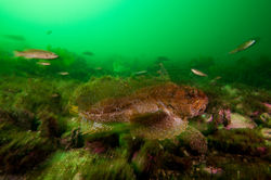 ![]() An Atlantic wolf fish (Anarhichus lupus) peers out from its den. The males of this species will guard the eggs once fertilized. | ![]() The sea raven (Hemitripterus americanus) is one of the most camouflaged and unique fish in the North Atlantic. Gadd's Wall, Gros Morne National Park, Newfoundland, Canada | ![]() The sea raven (Hemitripterus americanus) will lay in wait along drop-offs and slopes. Bonne Bay, Newfoundland, Canada |