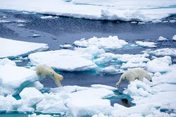 ![]() Canada geese (Branta canadensis) photobomb a mother Atlantic walrus and her large calf (Odobenus rosmarus rosmarus). Foxe Basin, Nunavut, Canada | ![]() Clouds reflected on the mirror-calm waters of Nares Strait, a narrow channel between Ellesmere Island and Greenland. | ![]() Male polar bears (Ursus maritimus) have long guard hairs on their front legs and can be much larger than female bears. This lone male was later seen stalking and chasing a bearded seal unsuccessfully. |